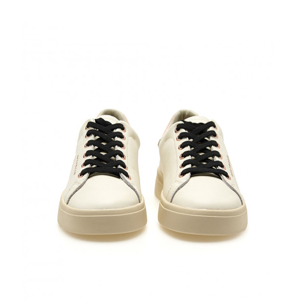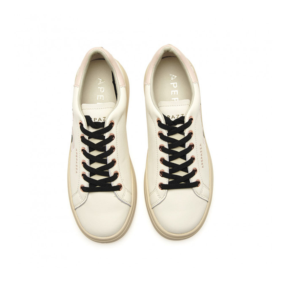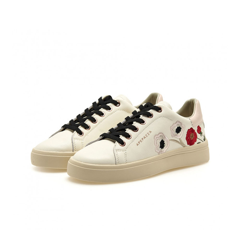 Este ténis em pele branca destaca-se pelo seu refinado bordado floral multicolorido em tons de rosa e vermelho que decora a lateral. O calcanhar em tom pastel e os atacadores pretos contrastantes completam o design. Graças à palmilha em pele, o calçado garante respirabilidade e conforto constante, ideal para transitar facilmente do escritório para uma saída à noite.