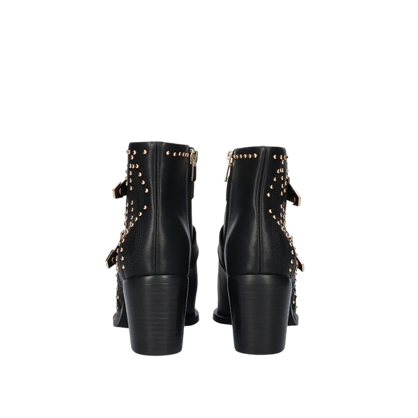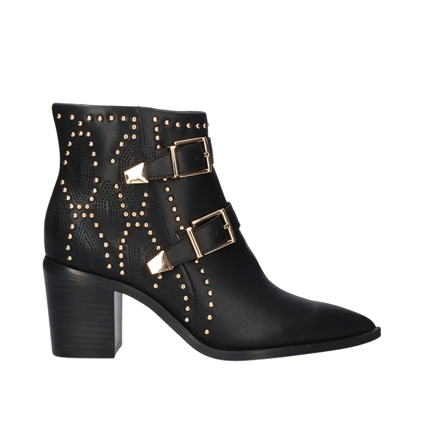 Botim em pele preta com aplicações e fivelas douradas.