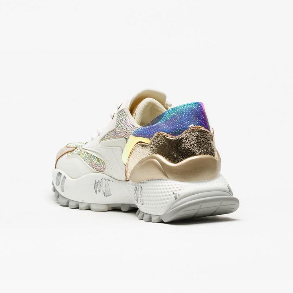 Sapatilhas de pele e tecido com sola de borracha multicolor. Forro em tecido e palmilha em pele.