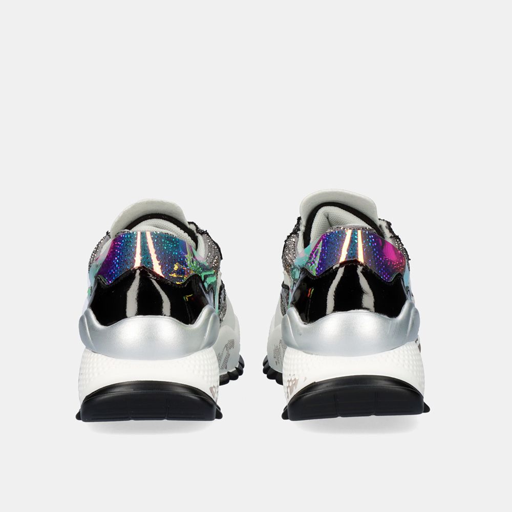 Sapatilhas em preto e prateado. Seu corte de 4 cm e sola são feitos de material sintético, a palmilha é feita de material têxtil.