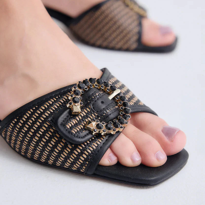O preto domina, mas ganha nova vida através do jogo de transparências na pala, que cria um efeito leve e sofisticado. A aplicação decorativa acrescenta brilho na medida certa, elevando o modelo sem exageros.