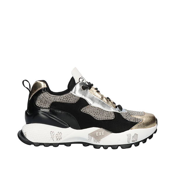 As sapatilhas EXE D190608-22A BLACK/GOLD destacam-se pelo seu design marcante em tons de preto, enriquecido com detalhes metalizados em dourado e prateado, bem como aplicações de strass que acrescentam brilho e sofisticação ao modelo.