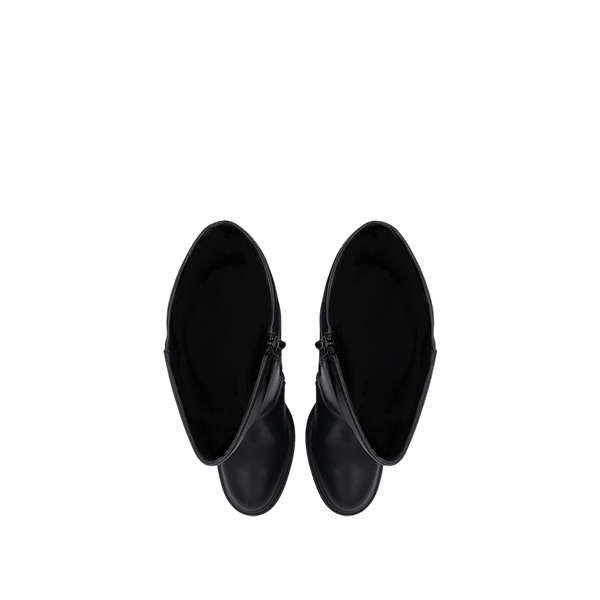Botas altas feitas de couro, com haste equipada com inserção elástica e zíper na parte interna. Apresentam logotipo monograma, sola de plataforma confortável e detalhe de grandes vendas com logotipo em relevo. O salto tem 10 cm de altura, a plataforma 2,5 cm e o eixo 37 cm.