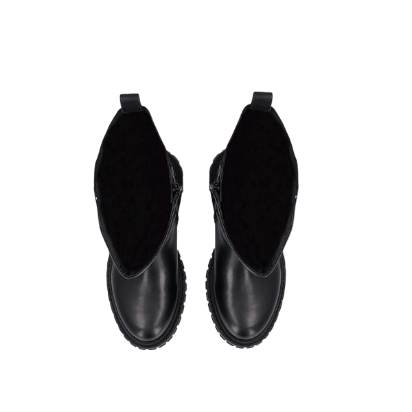 Botas de couro até ao joelho, com inserções elásticas, fecho interno com zíper e logotipo monograma. A sola possui rebordo com a marca e entalhes, com altura de 5 cm, enquanto a altura da perna é de 31 cm.