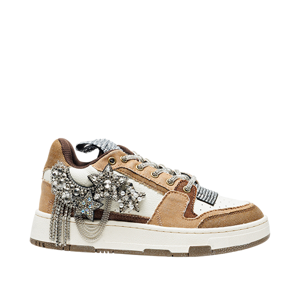 Sapatilhas Nan-Ku Couture EFE-03 em cor castanha — elegância e irreverência num só par. Com um design em pele e tecido, este modelo destaca-se pelas aplicações laterais em forma de estrela, repletas de brilhantes e correntes que conferem um efeito glamuroso e exclusivo.