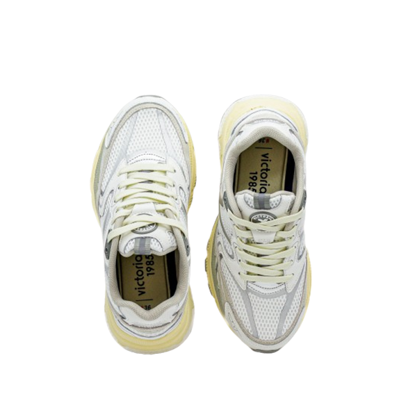 Sapatilhas desportivas para mulher da coleção victoria 1985 com a nova sola MYTHOS. Este modelo se destaca pelo design moderno, com as solas em destaque. O material superior e as laterais são feitas de malha, que proporciona respirabilidade e um look esportivo. As solas, que dominam o modelo, apresentam um design vanguardista e garantem leveza e conforto. Perfeito para quem busca estilo e conforto a cada passo.