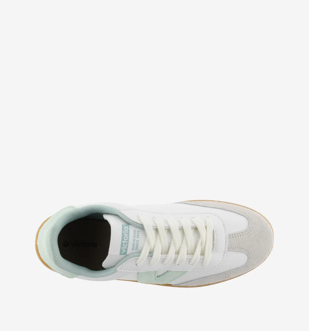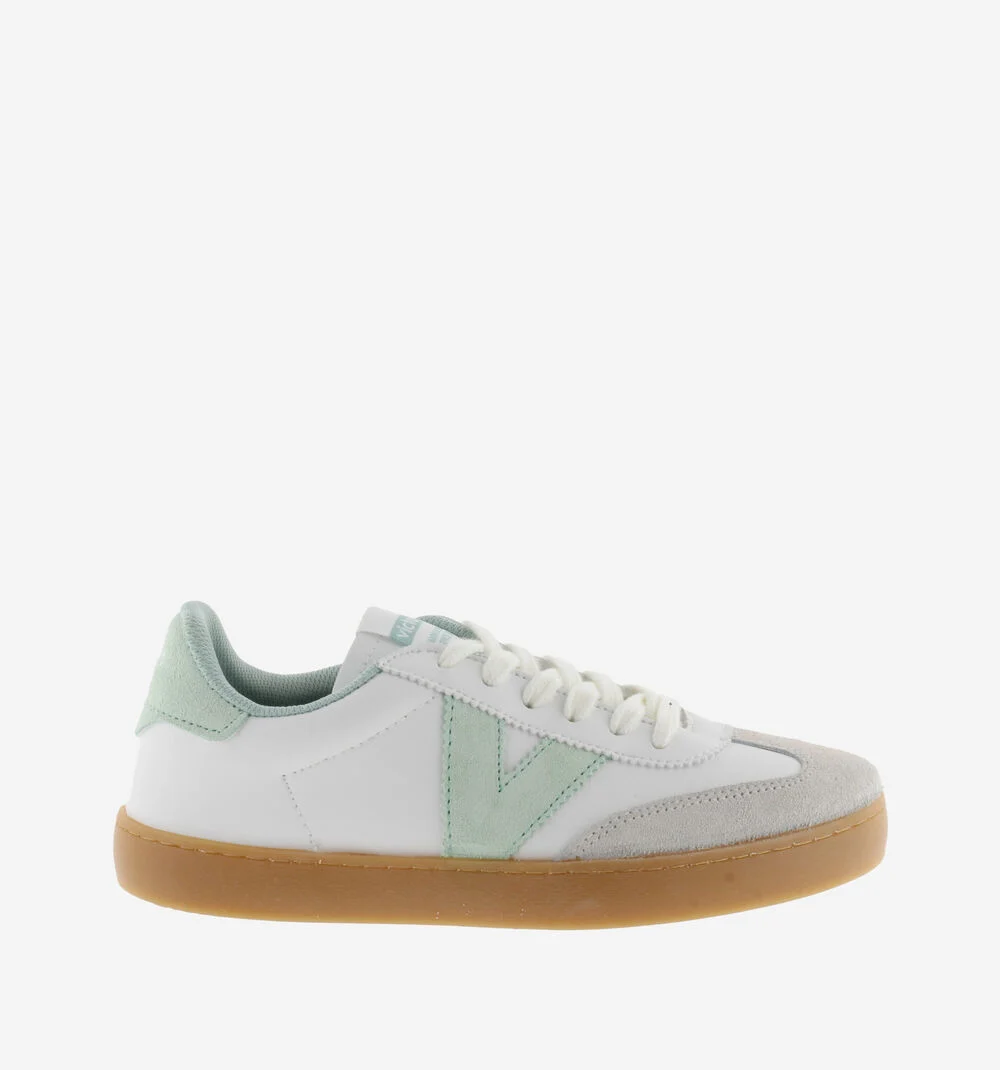 Sapatilhas para mulher fabricadas em Espanha em efeito pele branca com peças em camurça. V lateral da victoria, forro e peça traseira em cores a condizer em contraste. Sola de T.R. translúcido cor caramelo.